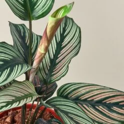 - Description: The Zebrina is a unique calathea variant native to Southeastern Brazil. Classified as an evergreen perennial, this plant displays grey-green stripes on its dark jade foliage. This plant is quite delicate and requires a good amount of attention to keep this plants distinctive sheen. It is best to keep this plant in indirect sunlight as to not burn the leaves.