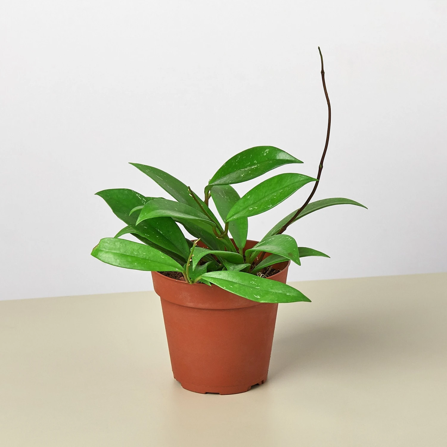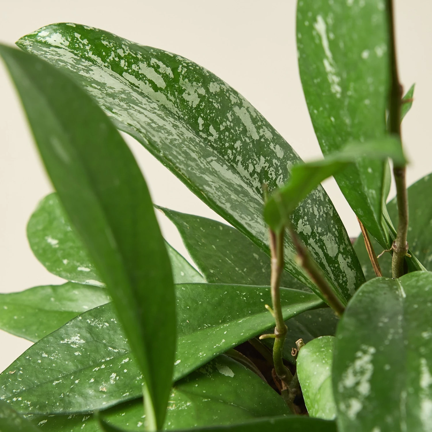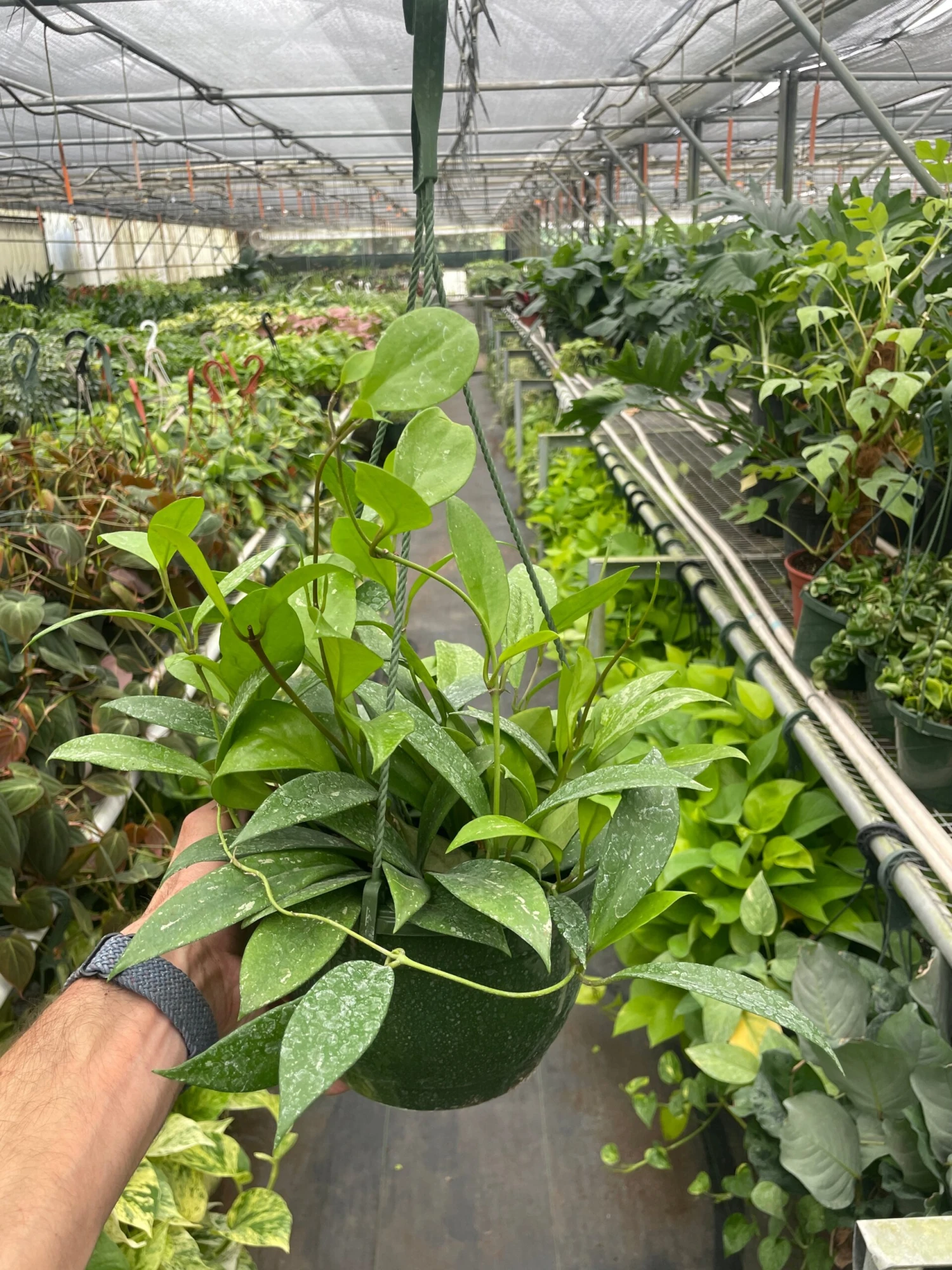 - Description: Hoya publicalyx is a vigorous vining plant with deep green lanceolate leaves, eager to climb up a trellis or cascade gracefully over the sides of its pot. Its leaves are often mottled with flecks of silvery variegation, and depending on how much light it receives, the stems can take on shades of purple.