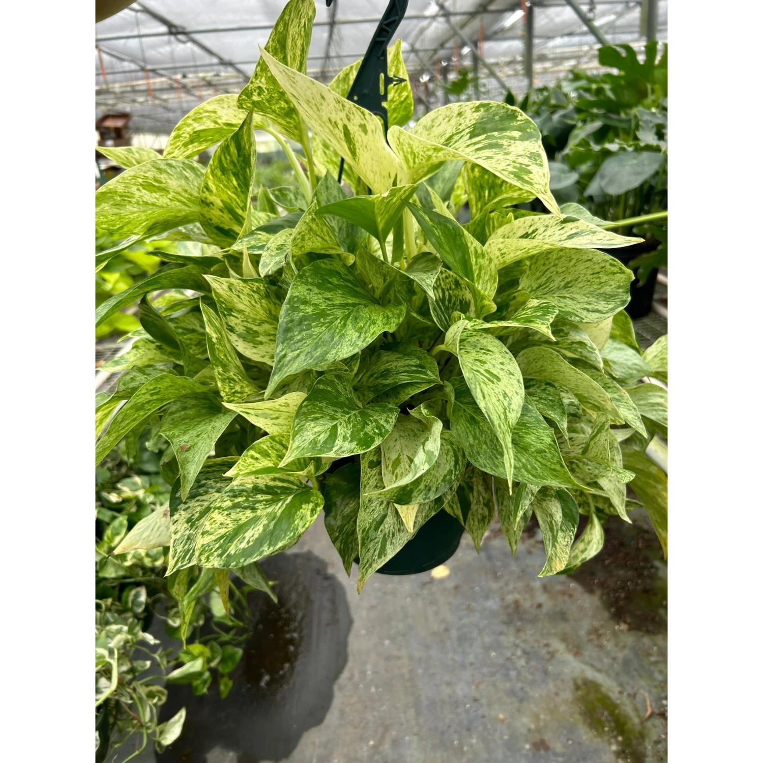 - Description: This Pothos is a variegated version with more white than green. It is so easy, perfect for beginners, as pothos is one of the easiest plants to grow. This plant is so easy going. You can grow it in a hanging basket, let it climb or even grow horizontally along a tabletop or mantle. This plant will tolerate any light condition, though it’s preference is moist soil and medium to high light spots. It even forgives for the occasional missed watering! No need to fertilize very often, maybe twice per year.
